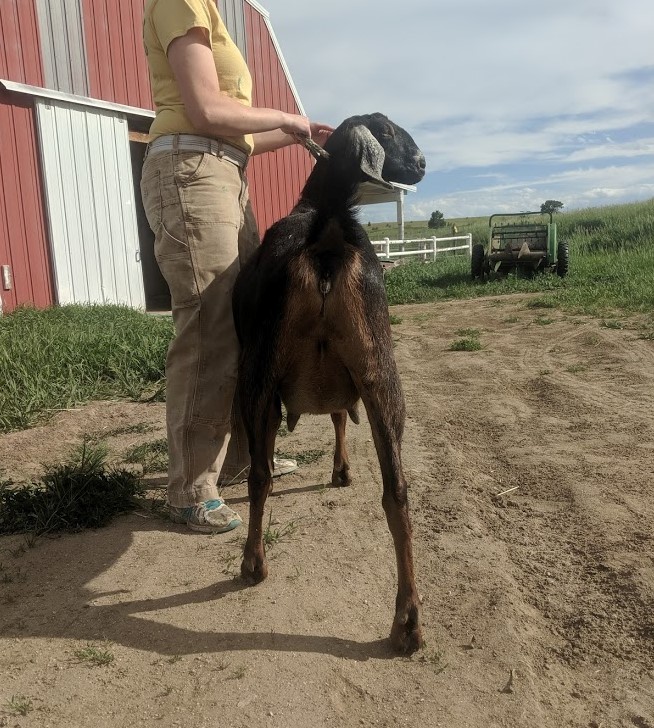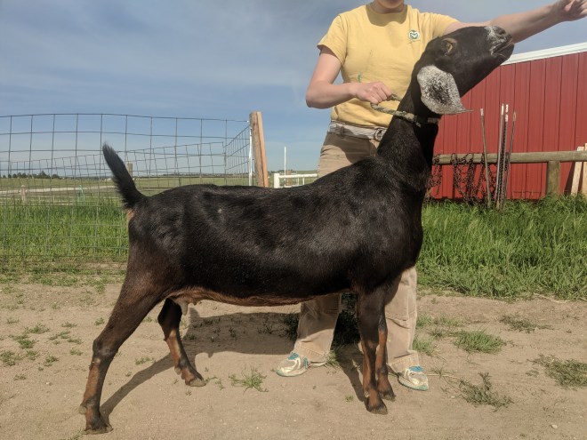 Marian is a gentle, brown and black nubian doe. She is five years old and she has freshened twice. She’s good on the stand and milks easily. Milks about a half gallon a day.