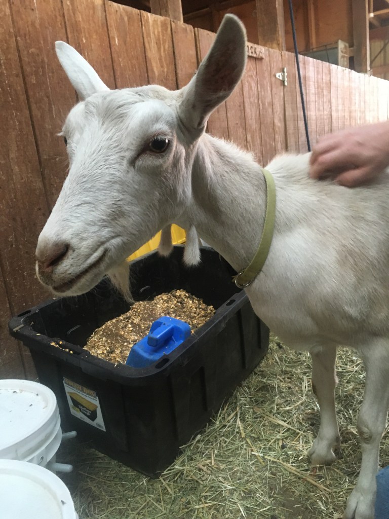 Hi there! My name is Peyton. I’m a 2.5 year old 3/4 Saanen 1/4 Alpine cross. My people tell me I have the sweetest personality and the loudest voice. I do talk a lot! I just don’t want to be forgotten! Sometimes I feel like I get lost in the sea of other white goats because I am small and gentle. This is my first year milking. I had one baby in May. Her name is Jazz. I love spending time with my sister, Cotton, and playing in the pasture. I hope you have a nice day! And if you come to visit me, please bring apples! They are my favorite.